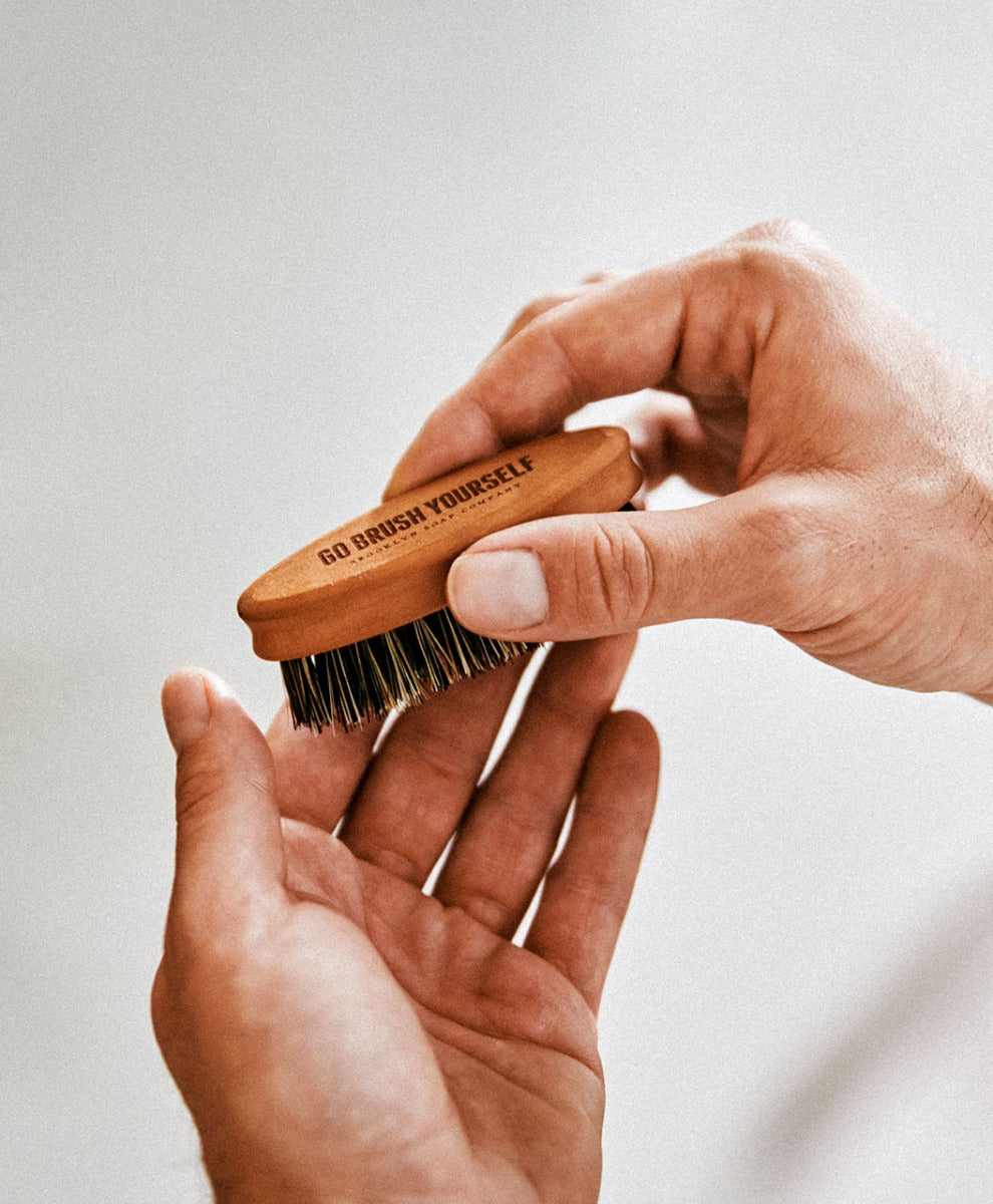 Bürste von oben nach unten über deinen trockenen oder nassen Bart. Nimmst du dazu etwas Bartöl, fühlt er sich noch weicher, glatter und besser an.