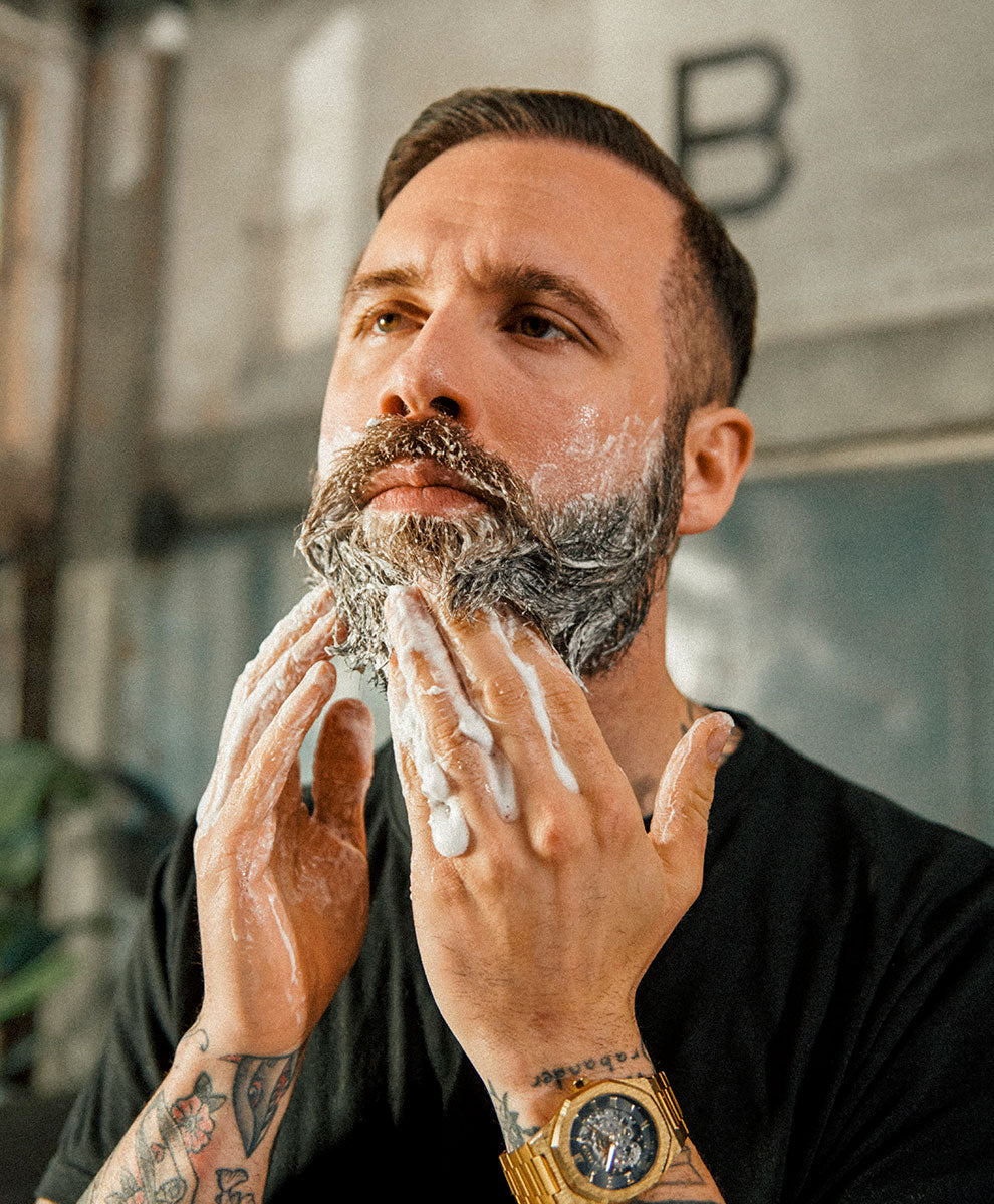 Verteile eine ausreichende Menge Bartshampoo zwischen den Handinnenflächen. Massiere sie zwei Minuten lang kreisend in den Bart ein, bis sich die weiche, gering schäumende Seife gleichmäßig im Bart verteilt hat. Anschließend spülst Du alles gründlich aus.