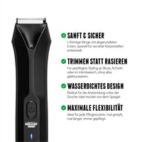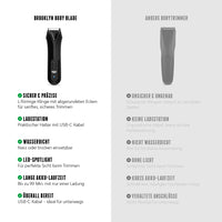 Die Brooklyn Body Blade ist ein Körpertrimmer, speziell für die Körperbehaarung entwickelt. Dank ihrer Wasserfestigkeit ist sie auch perfekt fürs Trimmen unter der Dusche geeignet.
