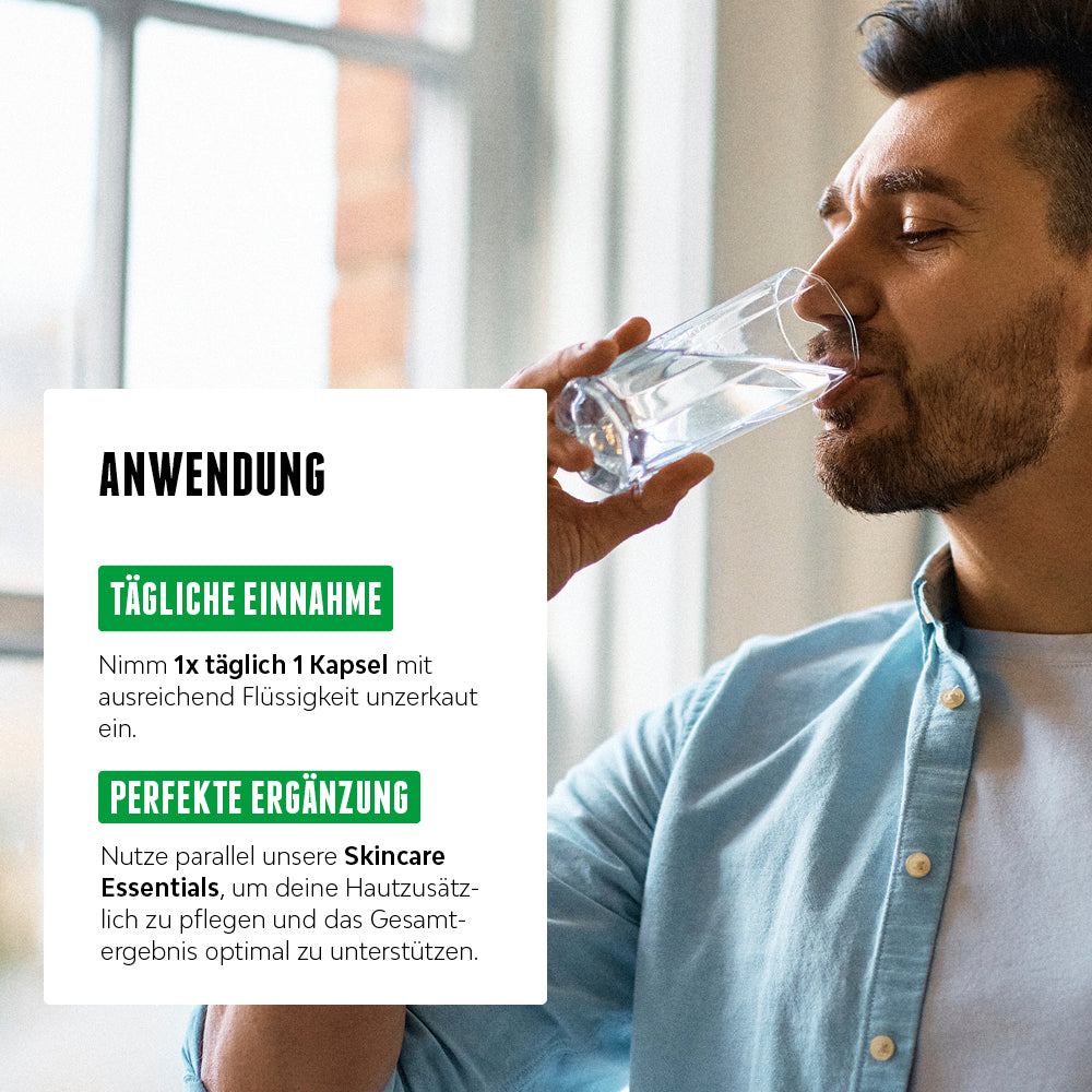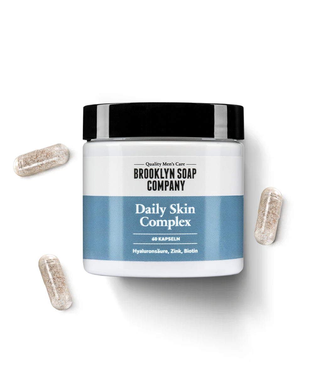 Mit Hyaluronsäure, Biotin, Zink, L-Cystein, Vitaminen und Rispenhirsekonzentrat trägt der Daily Skin Complex zur Erhaltung gesunder Haut bei und unterstützt die Kollagenbildung von innen heraus.