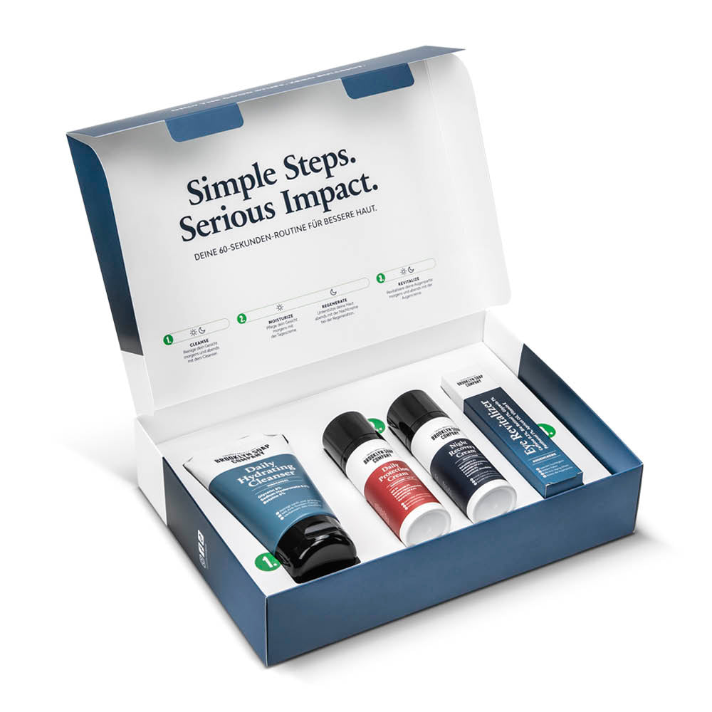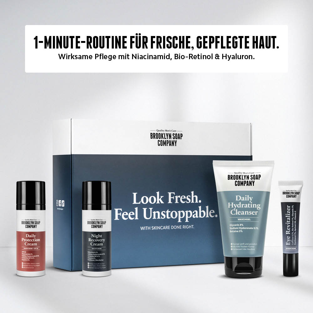 Dieses Set ist gemacht für alle, die ihre Hautpflege ernst nehmen möchten, aber nicht wissen, wo sie anfangen sollen. Vier Produkte, die perfekt aufeinander abgestimmt sind, helfen dir dabei, eine einfache und effektive Routine in unter 1 Minute zu etablieren. Die hochwertige Verpackung und die beiliegende Anleitung erleichtern dir den Einstieg. Mit dabei: eine Tagescreme mit Lichtschutzfaktor 30 – schützt deine Haut zuverlässig vor UV-Strahlung und beugt lichtbedingter Hautalterung vor