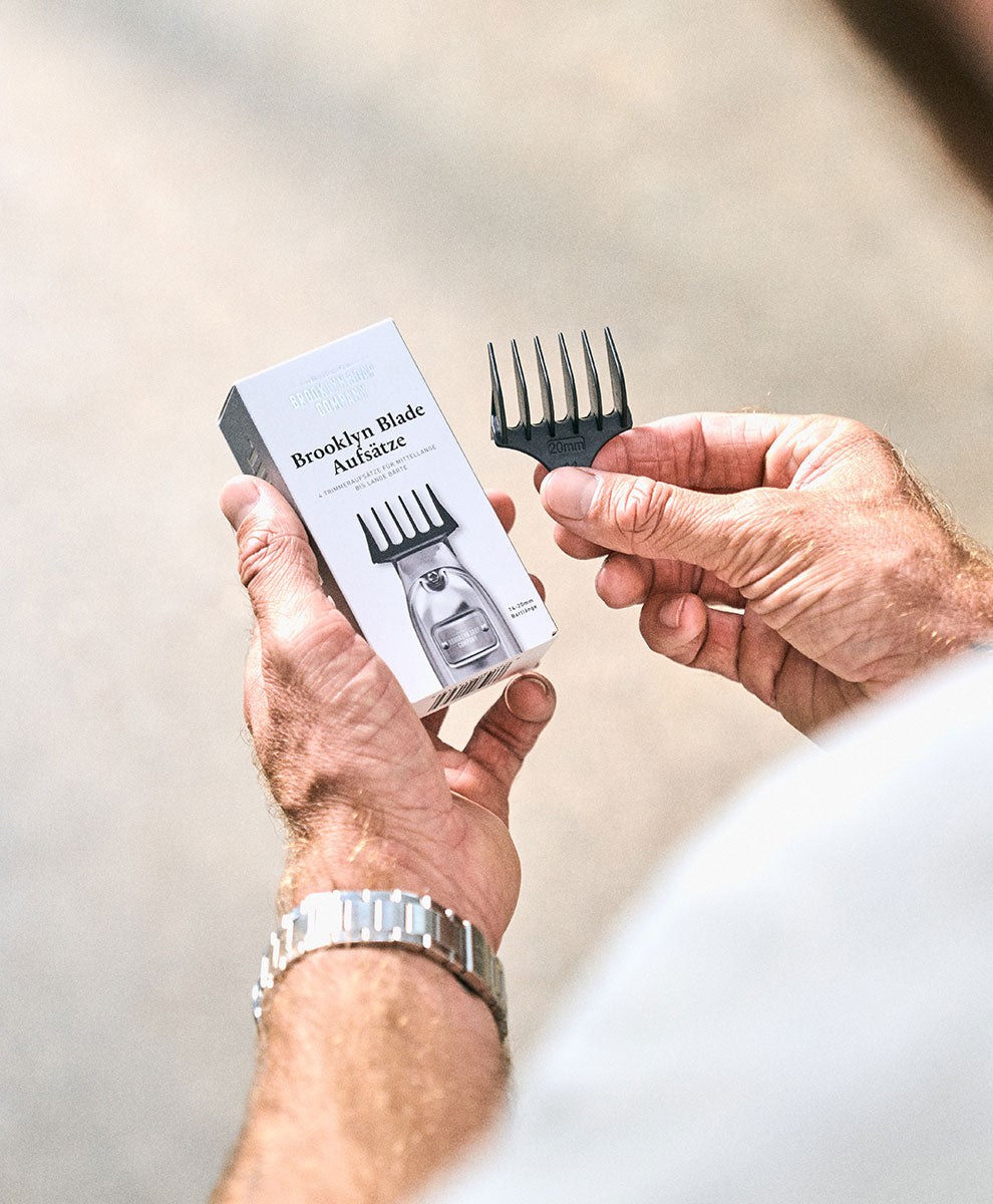 01. Wähle einen Kammaufsatz nach der jeweiligen Wunschlänge deines Bartes aus. Die Angabe auf jedem Kammaufsatz entspricht der Bartlänge in Millimetern Tipp: Beginne mit einem größeren Aufsatz, um Erfahrungen beim Schneiden mit der Brooklyn Blade zu sammeln.